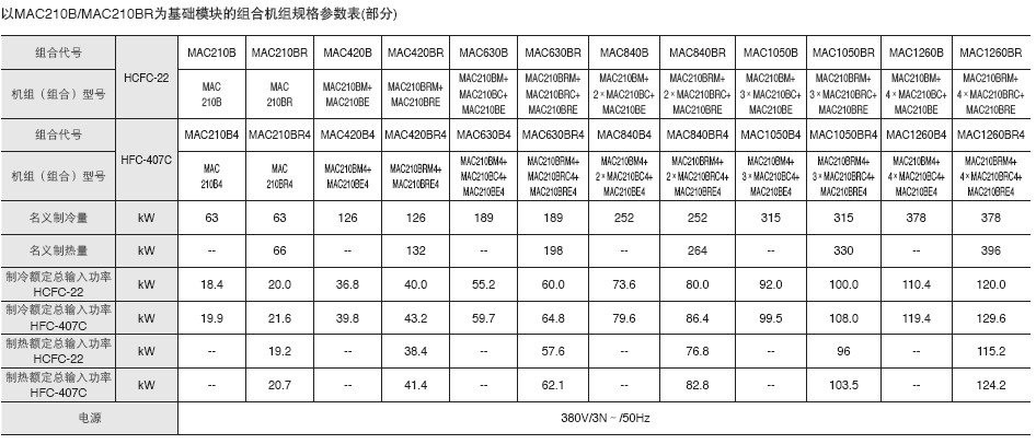 ■三種基本模塊單元,可實現1?10 個同冷量模塊自由組合。另有HFC-407C 環保制冷劑可供選擇。