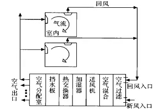 圖1所示的是某酒店中央空調(diào)的示意圖:空氣從回風(fēng)口和新風(fēng)口進(jìn)入空調(diào)系統(tǒng)入口,入口處設(shè)調(diào)風(fēng)門以控制進(jìn)風(fēng)量的大小,過濾后的空氣繼續(xù)往前,到空氣混合室,通過送風(fēng)機(jī)后,被送去加濕,加濕后的空氣送去冷卻或加溫(隨季節(jié)而定),經(jīng)擋水板,然后,進(jìn)入空氣分配室,再到送風(fēng)管,最后進(jìn)入空調(diào)室。