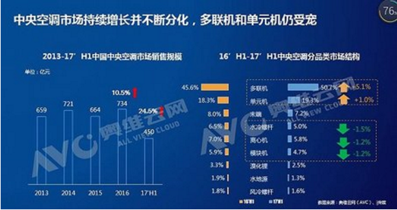 據張彥斌介紹,水冷機、離心機、模塊機等大型商用中央空調增幅呈下降趨勢,而多聯機、單元機增速與增幅都非?捎^。2017上半年,多聯機市場份額占比增加5.1%,增幅達50.7%;單元機市場占比增長1%,增幅19.3%,而許多主流空調企業已經或正在將單元機甚至多聯機等戶式中央空調空調納入家用空調的銷售體系內。