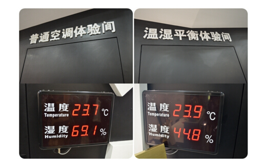大金空調(diào)溫濕平衡體驗(yàn)館里有兩間溫度幾近相同的房間,一間房間安裝了普通家用中央空調(diào),而另一間則安裝了大金全效家用中央空調(diào),我們從顯示板上看到兩個(gè)房間的濕度相差相當(dāng)大,讓我們走進(jìn)去感受一下舒適度究竟有怎樣的差別。