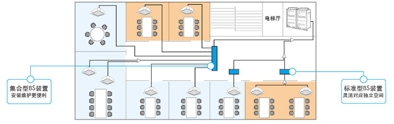 VRV自由冷暖系列通過追加BS裝置及吸入氣管,可實(shí)現(xiàn)在一套空調(diào)系統(tǒng)內(nèi)的同時(shí)制冷制熱運(yùn)轉(zhuǎn),充分配合各種建筑中的人性化冷熱需求。兩種BS配件選擇,大幅度提高設(shè)計(jì)靈活性:標(biāo)準(zhǔn)型BS裝置和集合型8S裝置可滿足不同的設(shè)計(jì)要求,標(biāo)準(zhǔn)型BS可靈活對應(yīng)獨(dú)立空間,集合型BS可使系統(tǒng)安裝維護(hù)更便利。