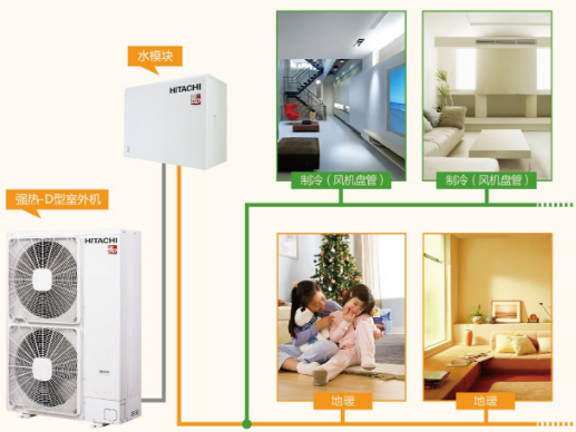 日立地暖+中央空調(diào)一體化系統(tǒng),是采用空氣源熱泵技術(shù),和中央空調(diào)共用一臺室外機,只是在整個系統(tǒng)中間增加了一個水模塊,用來提升水溫,最后將熱水輸送到地暖盤管內(nèi),加熱地板,從而達到地板輻射取暖的目的。